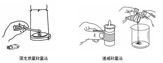 固定质量称量法如图所示。注意:若不慎加入试剂超过指定质量,应先关闭升降旋钮,然后用牛角匙取出多余试剂。重复上述操作,直至试剂质量符合指定要求为止。严格要求时,取出的多余试剂应弃去,不要放回原试剂瓶中。操作时不能将试剂散落于天平盘等容器以外的地方,称好的试剂必须定量地由表面皿等容器直接转入接受容器,此即所谓“定量转移”。